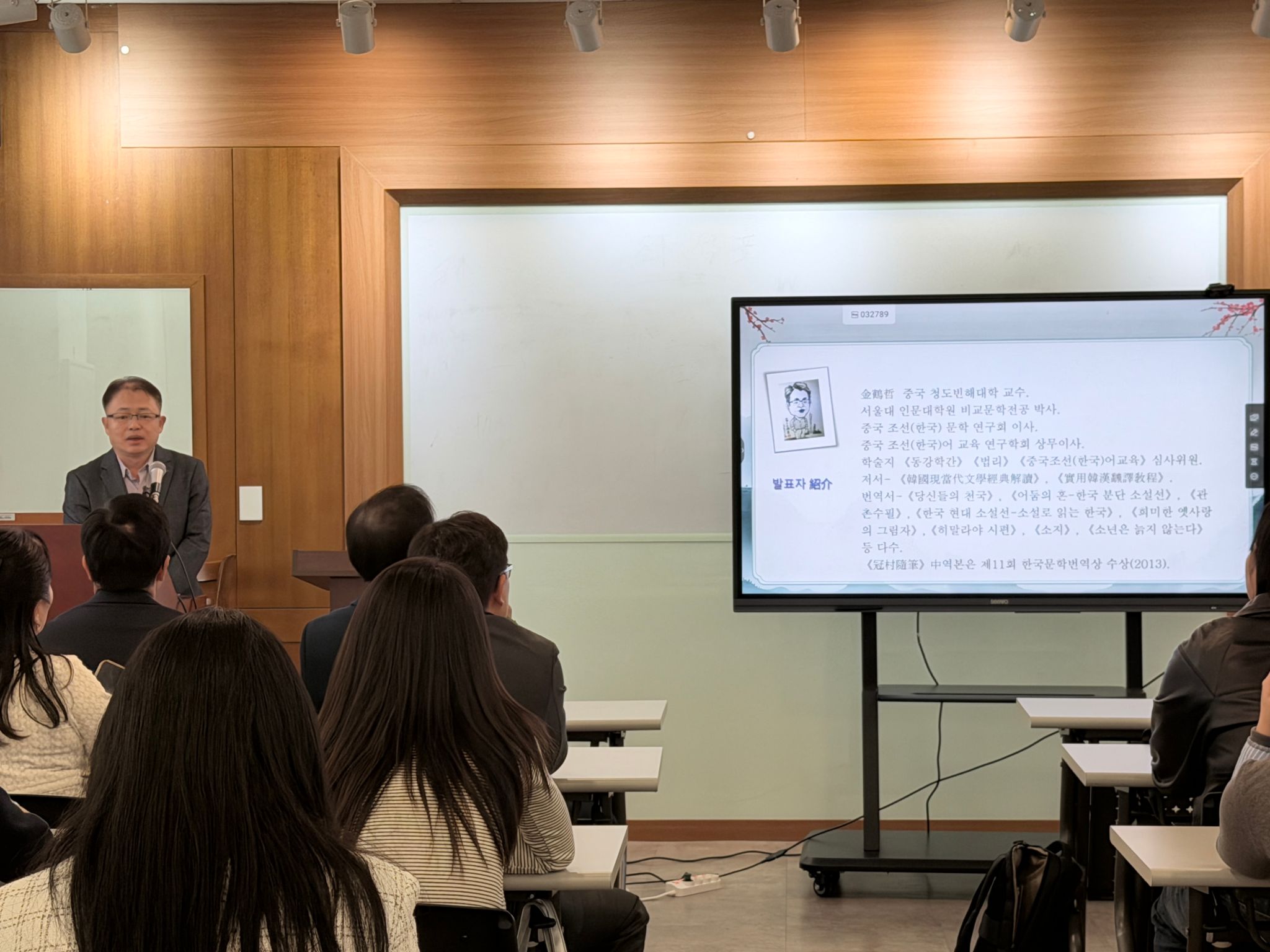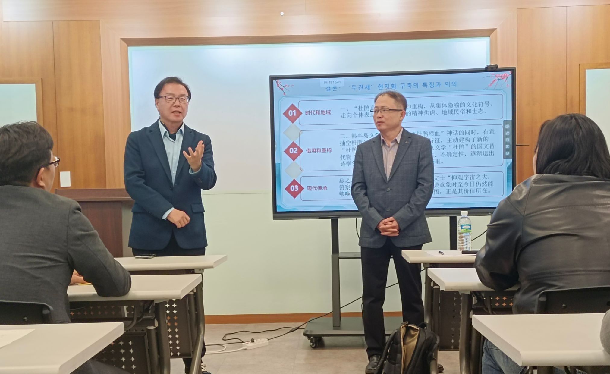 当地时间10月24日,应韩国外国语大学孔子学院邀请,著名韩国文学翻译家、青岛滨海学院金鹤哲教授在孔子学院作了题为《中韩诗学中的悲鸟杜鹃比较研究》的专题报告。韩国外国语大学孔子学院中方院长闫冬教授、韩国外国语大学语言文学院院长金在旭教授、韩国外国语大学中文系研究生及中国语言文化爱好者近30人参加了报告会。报告会由孔子学院韩方院长罗敏求教授主持。