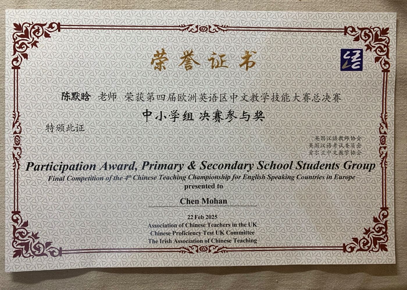 当地时间2月22日,由英国汉语教师协会主办的第四届欧洲英语区中文教学技能大赛总决赛在伦敦举行。本次大赛吸引了来自英国和爱尔兰的120余名中文教师参加。经过激烈角逐,最终22名教师进入总决赛。牛津布鲁克斯大学孔子学院国际中文教师陈默晗晋级总决赛并荣获参与奖。