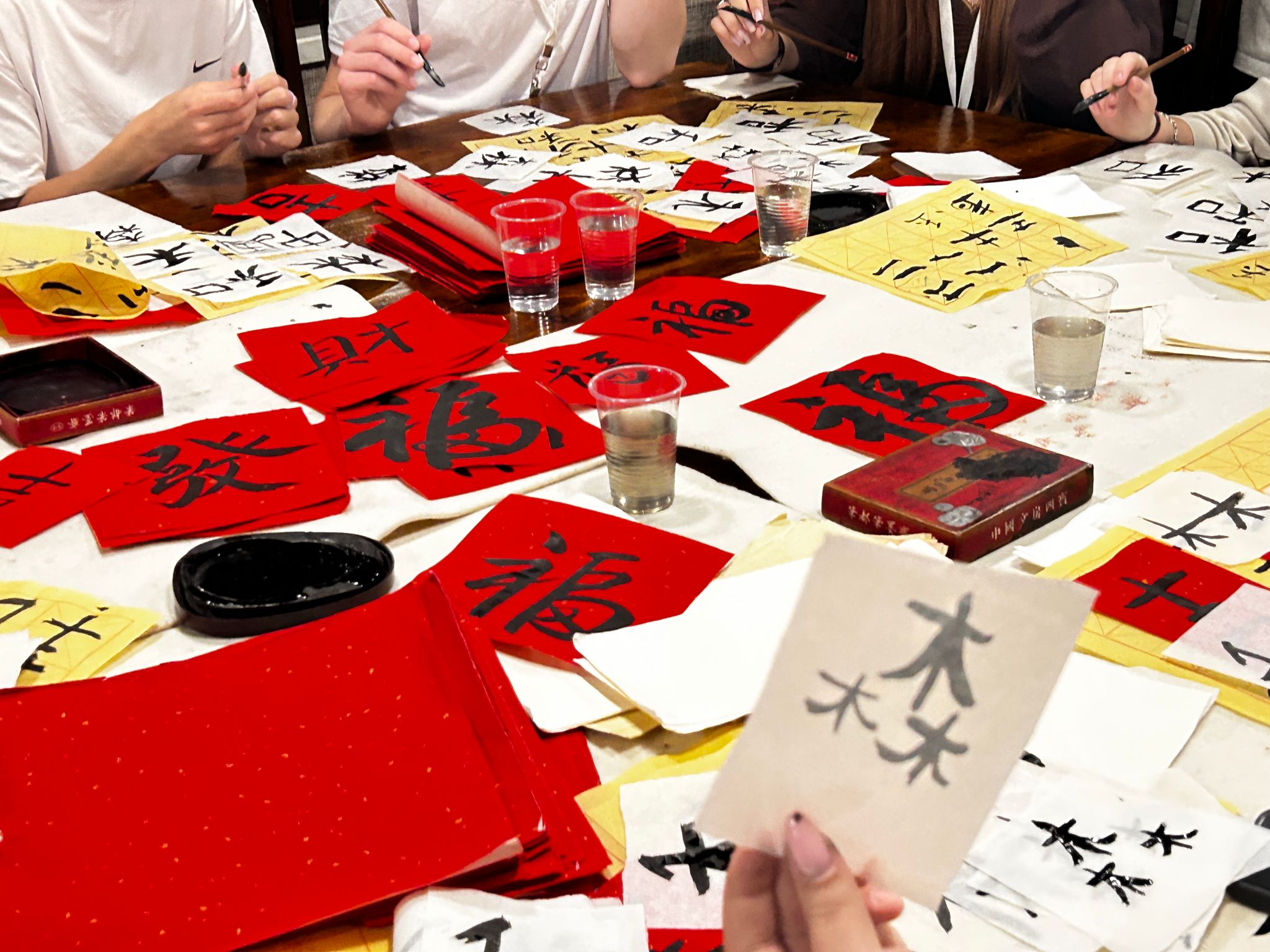 随后进入实践体验环节。老师为大家分发笔墨纸砚,手把手指导学生蘸墨、握笔和运笔。从简单的横、竖、撇、捺开始练习,大家认真专注,在笔锋游走间体会汉字的独特韵味。不少人还尝试书写自己的中文名字,或是 “福”“和”“爱”等寓意美好的汉字。书写过程中,墨香弥漫,好奇与专注写在每一名学生的脸上。许多学生虽是初次尝试,但对中国毛笔的柔韧与墨色的浓淡变化表现出浓厚的兴趣,纷纷向老师请教技法。