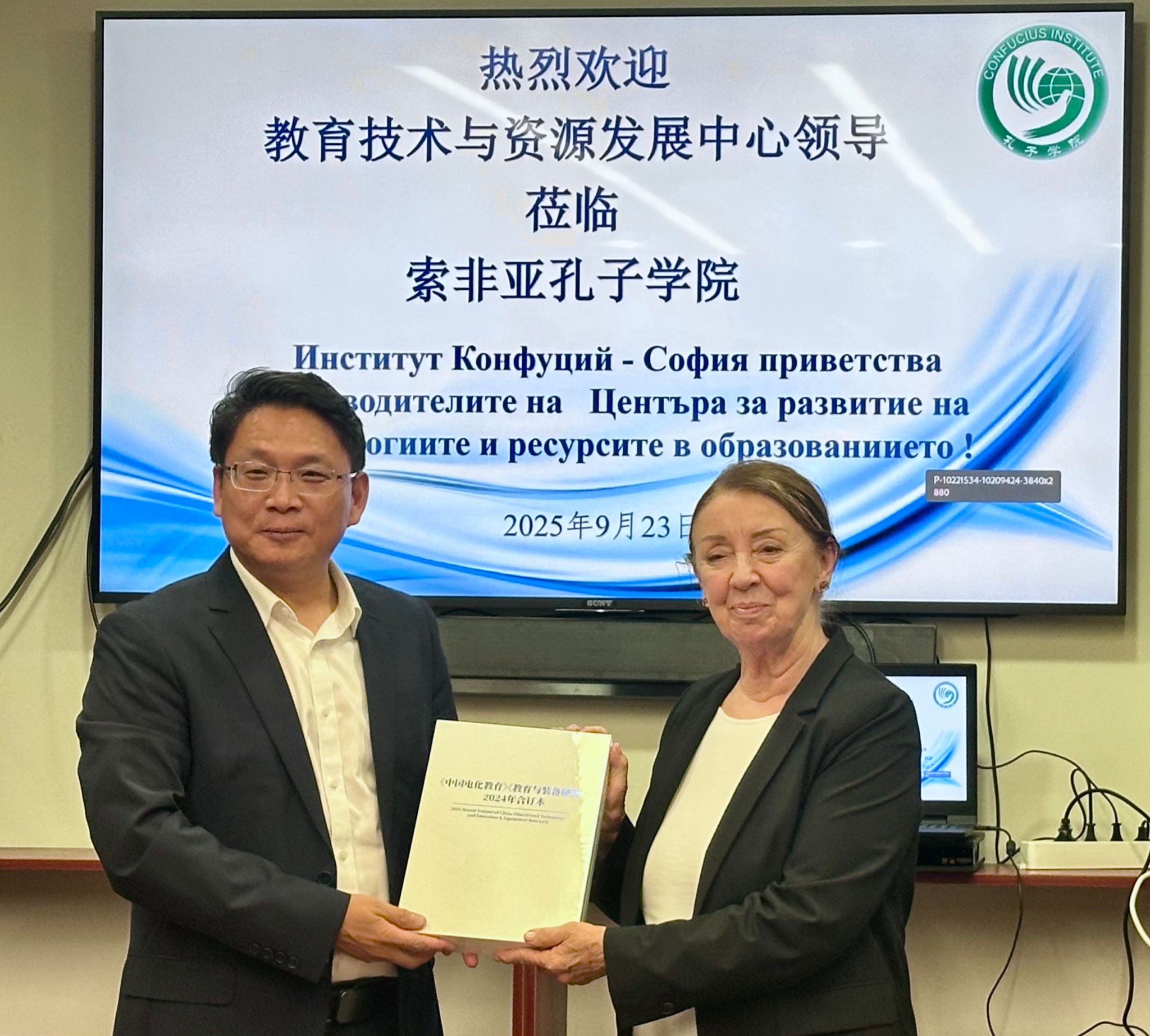 当地时间9月23日,教育部教育技术与资源发展中心副主任肖航率团访问索非亚孔子学院。中国驻保加利亚大使馆教育事务负责人杨天、大特尔诺沃大学孔子学院中方院长董元兴、索非亚孔子学院保方院长阿克西尼娅·科列娃(Aksiniya Koleva)、中方院长陈瑛等共同参加会谈。