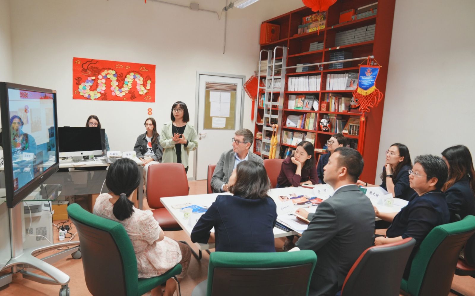 座谈伊始,马西尼对教育部资源中心代表团的到访表示热烈欢迎,并简要回顾孔子学院自成立以来在中文教学、文化交流和学术研究方面的发展情况。他指出,二十年来,孔子学院不断深化中意教育合作,积极推动本土教师培养及文化活动创新。随后,公派教师唐湘宜通过PPT和视频,介绍了孔院的文化活动和教师培训情况,并播放了孔院二十周年纪念视频。