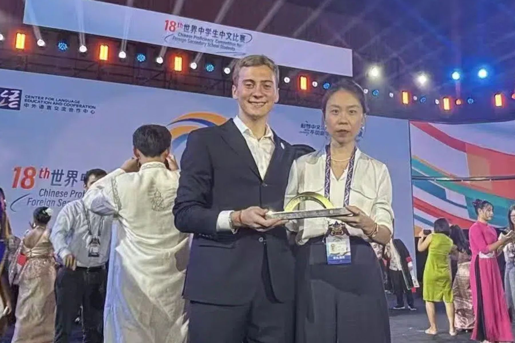 9 月 26 日,第十八届 “汉语桥” 世界中学生中文比赛全球总决赛在天津梅江会展中心圆满落幕。罗马大学孔子学院选手齐锐(Cirillo Ruggero)历经多轮激烈比拼,成功跻身全球前十,一举斩获 “全球一等奖” 与 “汉语大使” 荣誉称号。