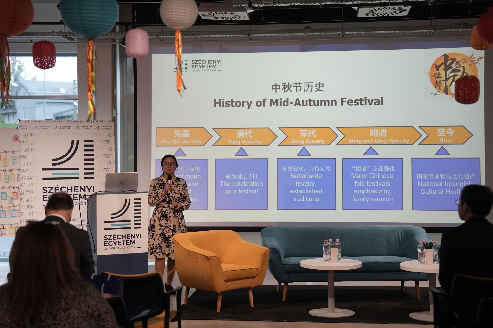罗兰大学孔子学院志愿者教师赵丽君和塞切尼・伊什特万大学教师申芝带来的 “中秋节的历史与习俗” 英语讲座让当地民众了解了中秋节文化。随后,塞切尼・伊什特万大学的白乐珊(Orosz-Barczi Réka) 进行了“中文轻松学” 匈牙利语讲座。在圆桌讨论环节,语言中心负责人娜塔莎(Borbély-Bailey Natasha)以 “个人视角下的中国文化” 为主题,与在该校中国留学生展开了英语讨论。之后,该校中国留学生和汉语学习者们共同朗诵了中文诗歌——《水调歌头》。