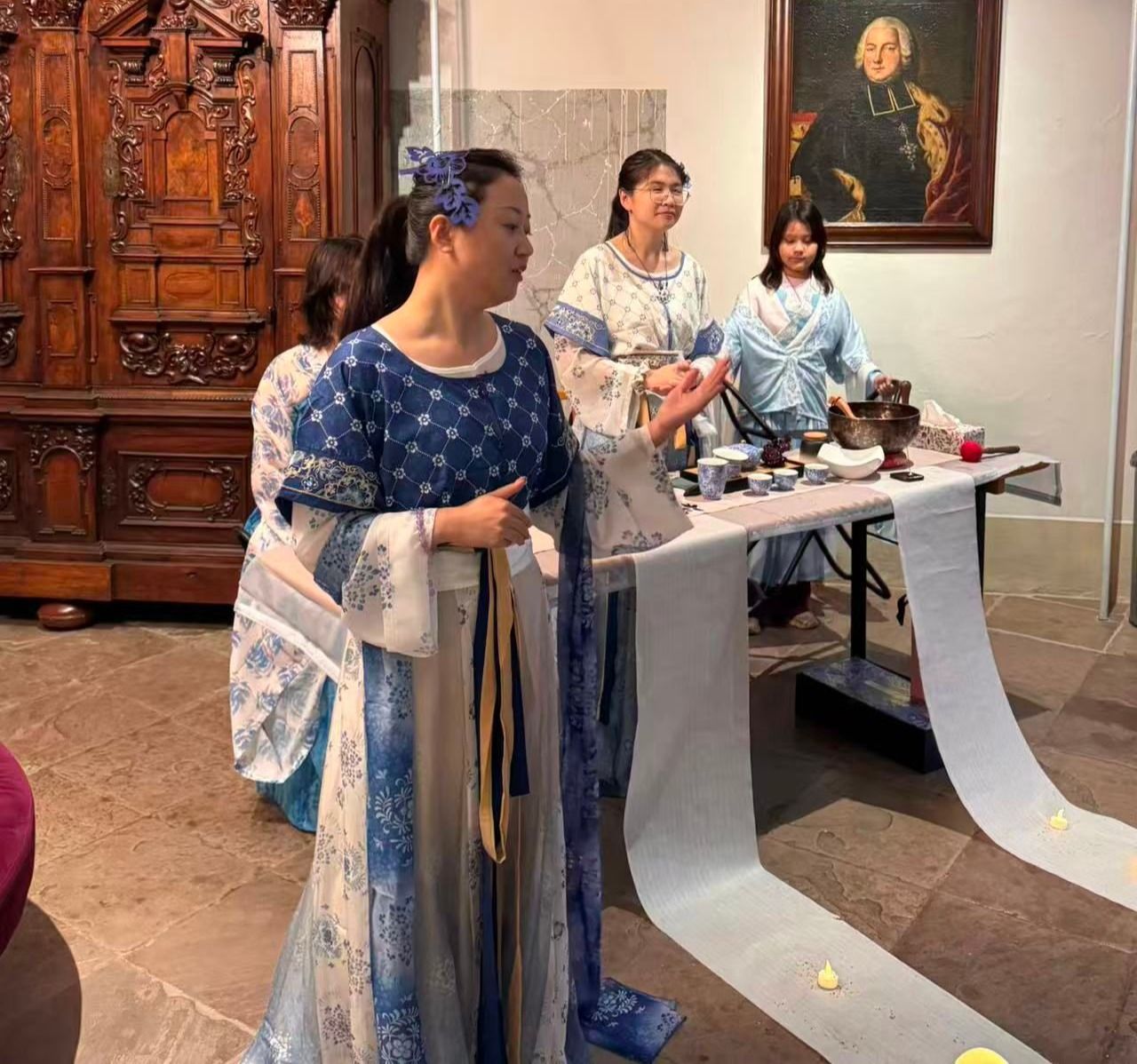充满汉唐意境的古典舞蹈将庆典推向高潮。拜罗伊特汉服协会的舞者们以“蓝白瓷”为灵感翩然起舞,衣袂飘飘、舞姿如云,将中国传统艺术的细腻与柔美演绎得淋漓尽致,赢得现场观众阵阵掌声并争相拍照留念。
