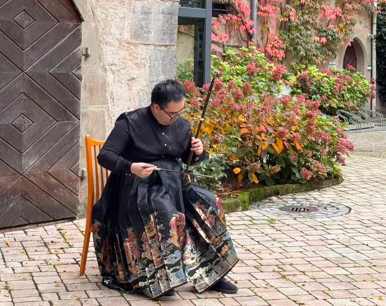 活动在悠扬的二胡声中拉开帷幕。来自埃尔兰根的青年演奏者朱乐健以一曲《赛马》点燃全场激情,又以《茉莉花》的柔美旋律带来东方诗意,令现场观众沉浸在独特的中国音乐意境之中。随后,拜罗伊特中华文化协会团队身着华美汉服带来了一场雅致的茶艺与舞蹈表演。在轻柔的古筝旋律中,茶艺师们娴熟地展示“煮水、烫杯、沏茶、奉茶”的优雅流程,一举一动尽显东方礼仪之美。