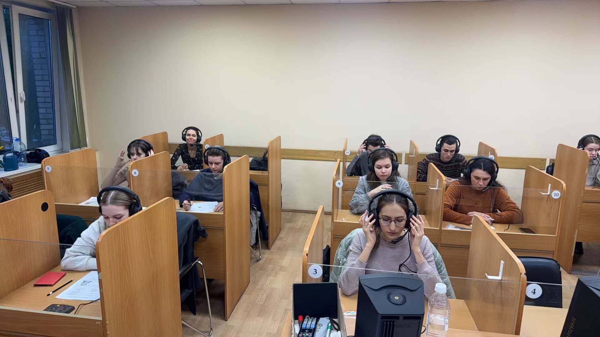 HSKK口语考试分批次在多个专用考场进行。监考教师细致讲解录音设备使用方法,明确考试注意事项,协助考生顺利完成音频录制。中方院长梅春才、俄方院长安德烈·谢列兹涅夫对各考场进行了巡视,密切关注考试运行情况