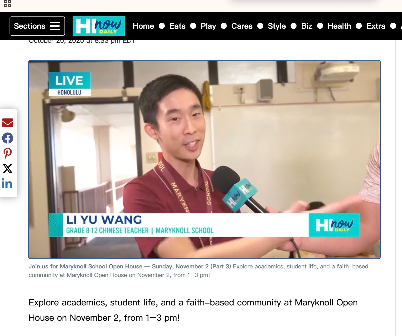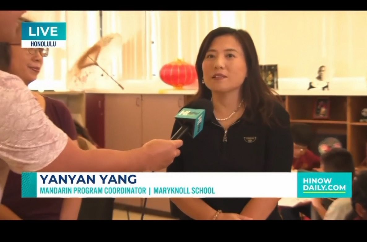 当地时间10月20日,夏威夷知名电视台《今日夏威夷》(HI NOW DAILY)节目报道夏威夷玛利诺学校(Maryknoll School)的中文沉浸式项目。中文项目负责人杨艳艳与师生代表接受了现场采访,向夏威夷公众介绍中文沉浸式课程特色,并邀请更多当地家庭参加课程。