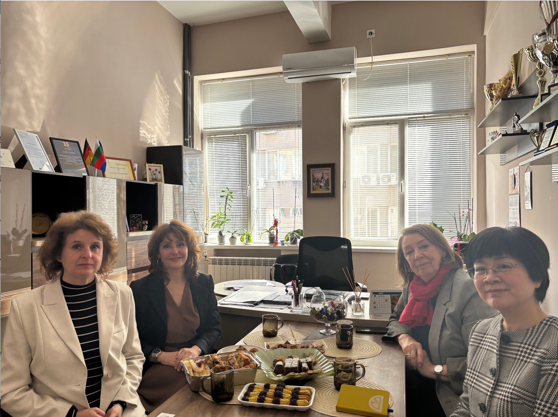 当地时间10月28日,索非亚孔子学院保方院长阿克西尼娅·科列娃(Aksinia Koleva)、中方院长陈瑛一行走访下设教学点蒙塔纳市彼得·博格丹外国语高中(Foreign language high school "Petar Bogdan")。孔院中保方院长与该校校长比利亚娜·德尔利潘斯卡(Bilyana Derlipanska)、副校长拉里萨·拉扎罗娃(Larisa Lazarova)举行工作会谈,就深化中文教学、拓展文化活动等议题进行交流。