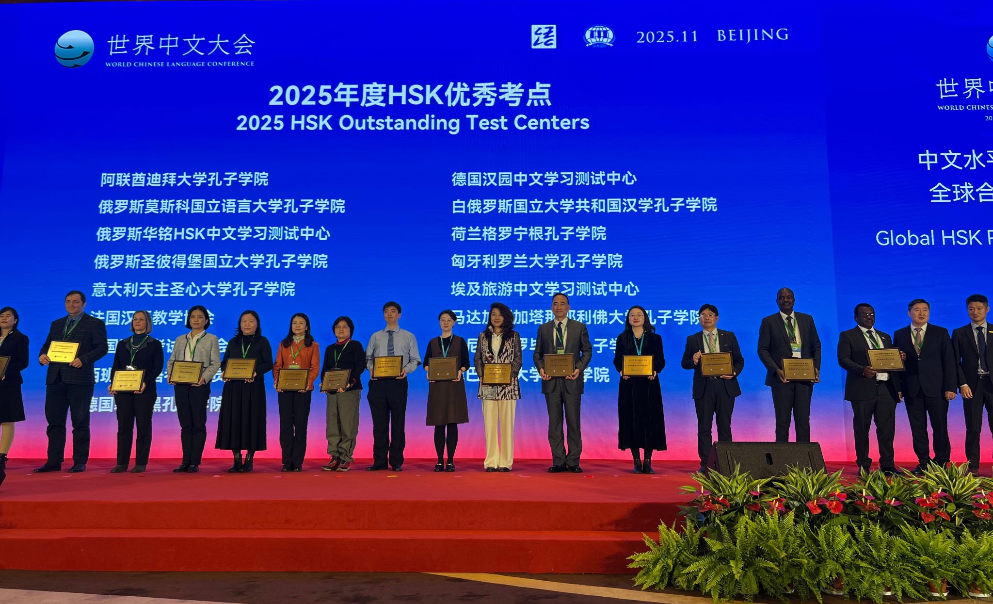 11月15日,世界中文大会专项会议——中文水平考试(HSK)全球合作伙伴大会成功举办。匈牙利罗兰大学孔子学院凭借在中文水平考试组织、推广及服务方面的卓越表现,从全球众多考点中脱颖而出,被授予“2025年度HSK优秀考点”称号。这不仅是对罗兰孔院多年来在中文教学与考试服务领域辛勤耕耘的高度认可,也标志着罗兰孔院在推动中东欧地区中文教育标准化、专业化发展方面取得了显著成果。