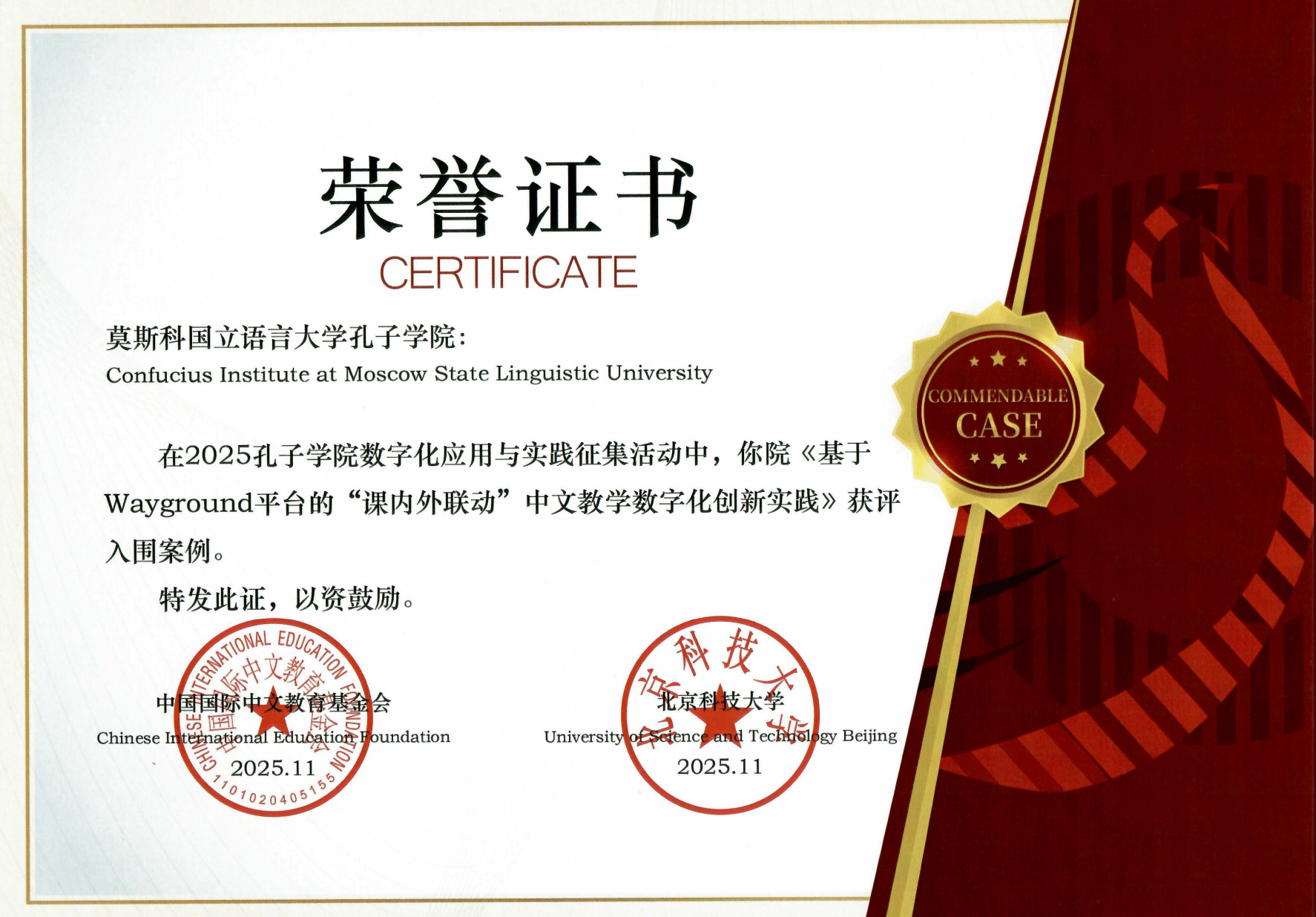 11月16日,由中国国际中文教育基金会与北京科技大学联合主办的2025孔子学院数字化应用与实践征集活动评选结果揭晓,莫斯科国立语言大学孔子学院(以下简称“莫语大孔院”)申报的《基于Wayground平台的“课内外联动”中文教学数字化创新实践》(案例负责人:海外志愿者教师张琴)获评入围案例。