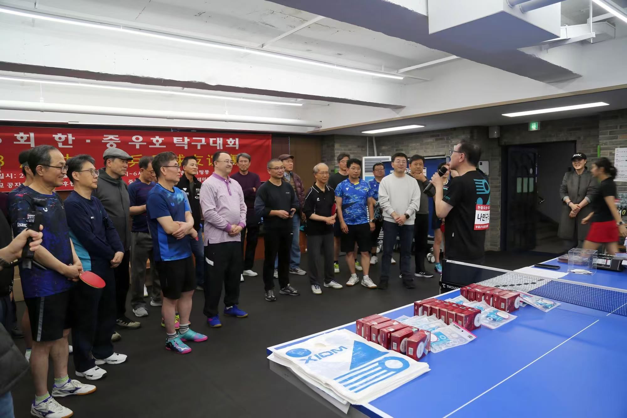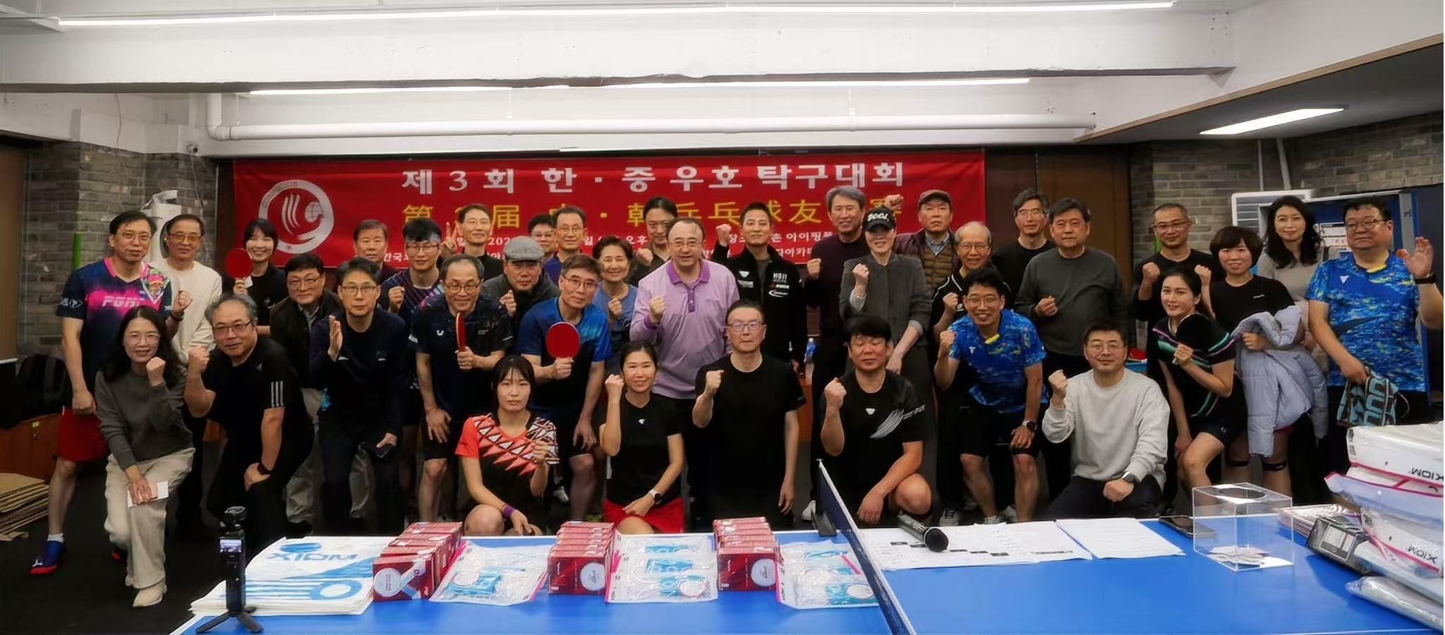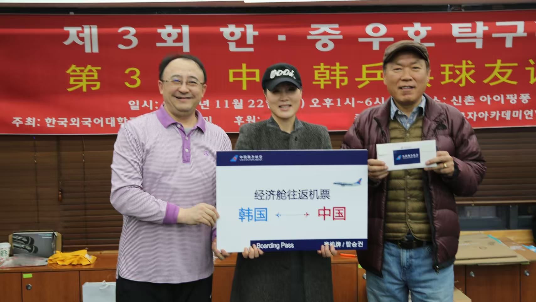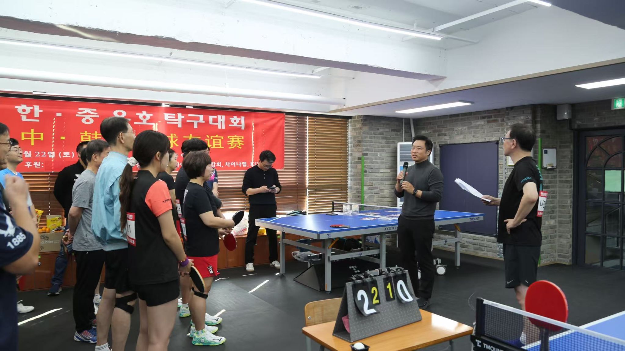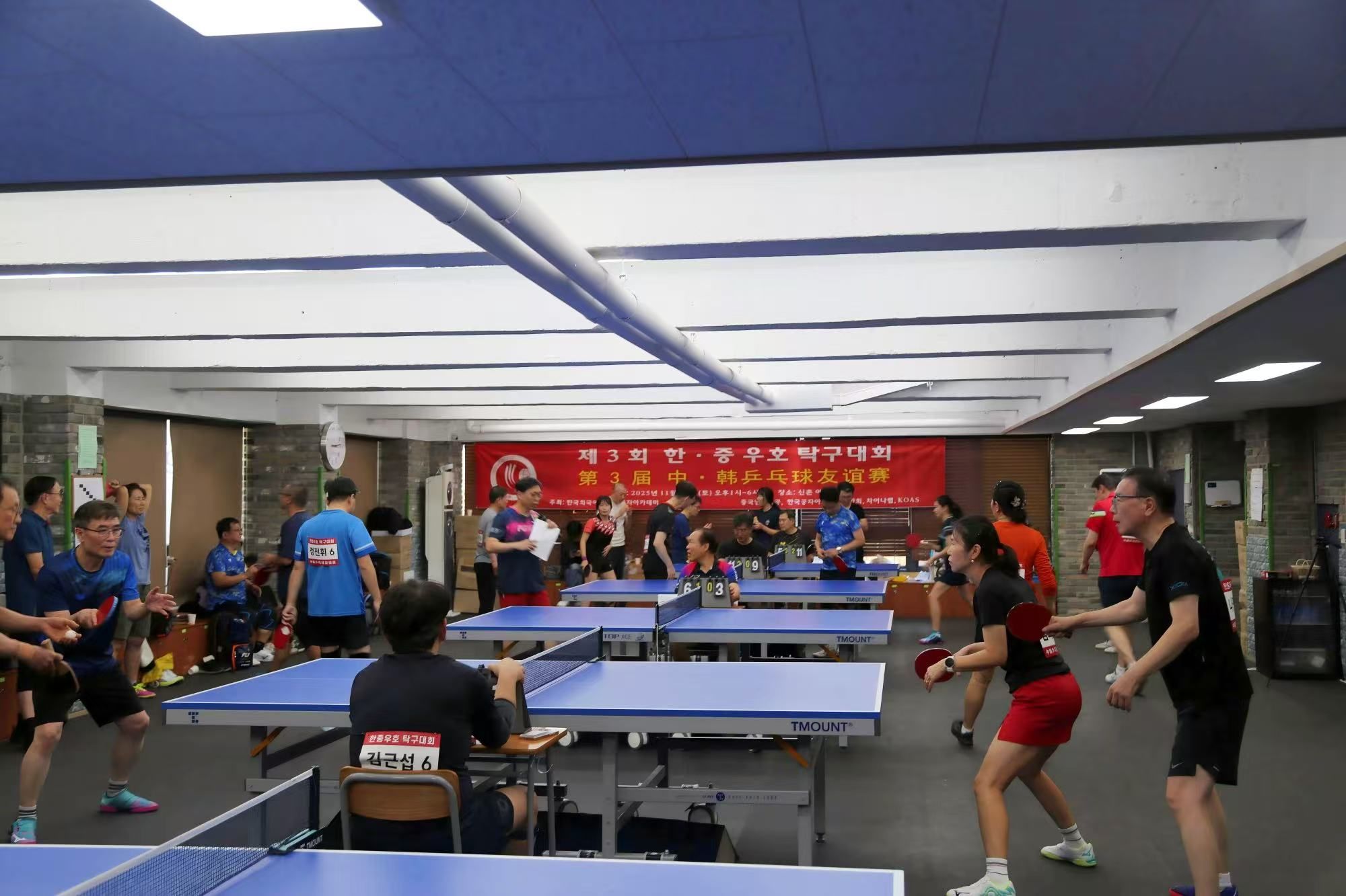 当地时间11月22日,由韩国外国语大学孔子学院主办的第三届中韩乒乓球友谊赛在首尔举行。本次赛事吸引了来自韩国外国语大学、首尔大学、延世大学、崇实大学、放送通信大学等多所高校,以及首尔永一高中、中央日报社、中国商会、中国南方航空股份有限公司、中国驻韩国大使馆等单位的40余位乒乓球爱好者同场竞技。中韩两国乒乓球名将焦志敏与安在亨作为特邀嘉宾出席了活动。本次活动得到了中央日报社、中国南方航空股份有限公司、KOAS家具公司、延世牛奶公司、LG集团等多家机构的大力支持与赞助。