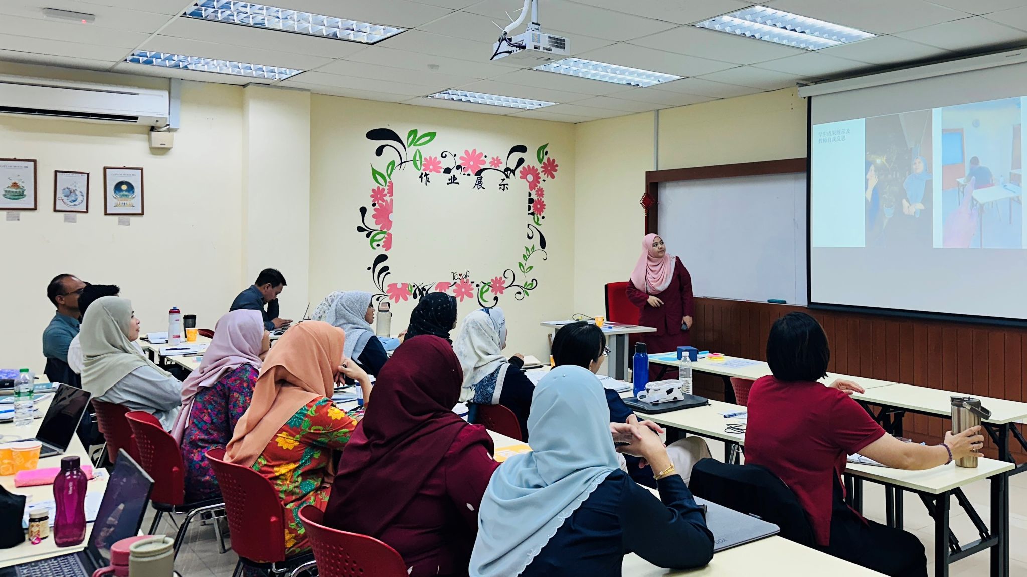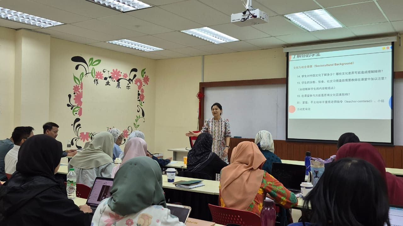 本次培训课程立足马来西亚多语环境,关注非华裔学生学习特点,为教师提供真实可行的教学方法,由孔子学院师资团队联合授课。马大孔子学院中方院长赵婉贞负责讲解《国际中文教育等级标准》的核心内容及其课堂应用,并带领教师学习中文课程大纲设计、教学案例研讨等内容;孔子学院本土优秀教师许曼文分享课堂活动设计、本土化教学实践,以及面向不同背景学生的教学案例;孔子学院公派教师苏羽佳围绕HSK考试体系、备考策略以及考务与报名流程进行深入介绍。