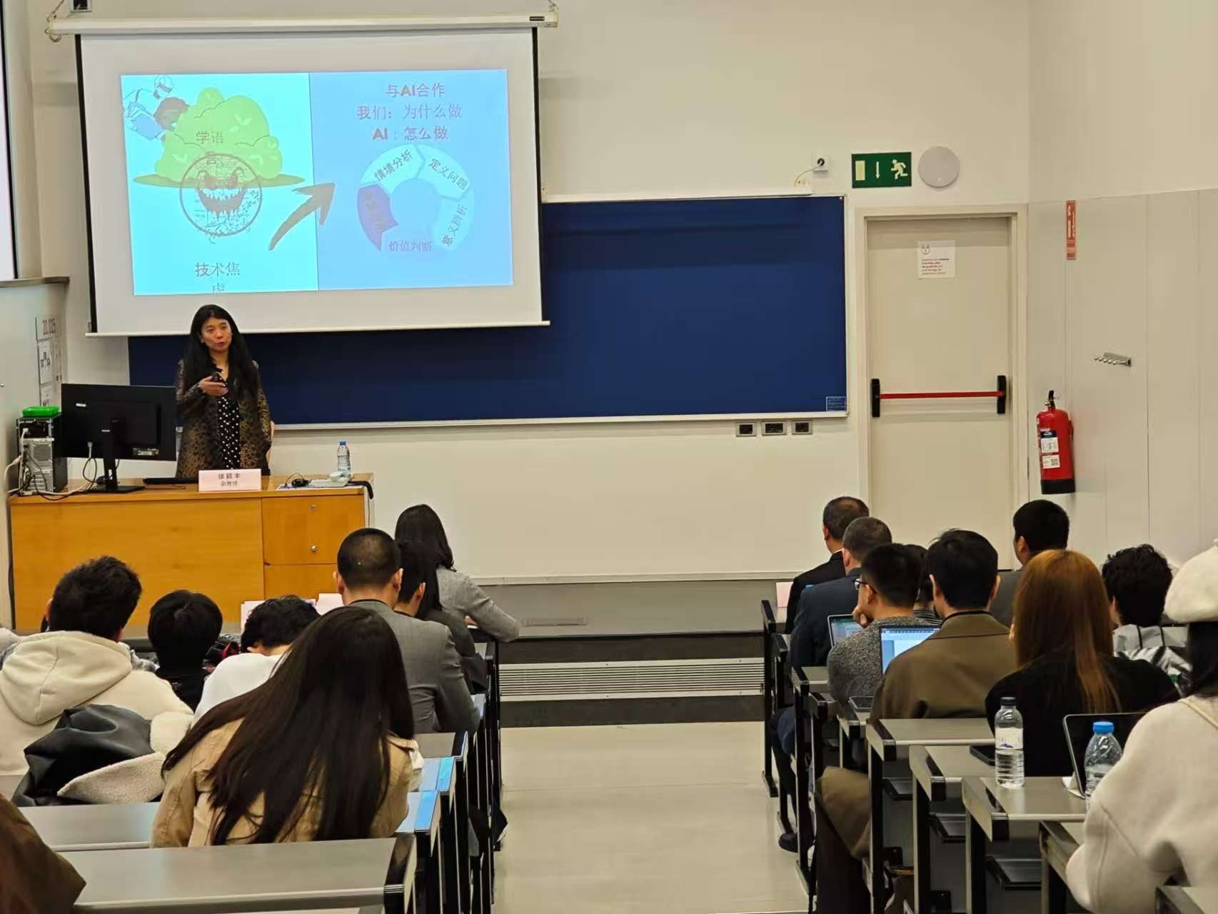 巴塞罗那孔子学院基金会教学协调员、庞培法布拉大学翻译与语言科学系教师徐颖丰受邀作主旨发言。她以“人工智能时代语言专业人才的职业发展”为主题,结合自身在国际中文教学和翻译实践中的工作经验,简要分析了人工智能背景下语言类专业的挑战与机遇。她指出,AI 技术虽然改变了语言服务的工作方式,但跨文化思维、语言判断力和专业伦理等能力仍不可替代。语言工作者需要在理解技术的基础上,与AI协作并不断拓展自身的专业角色。