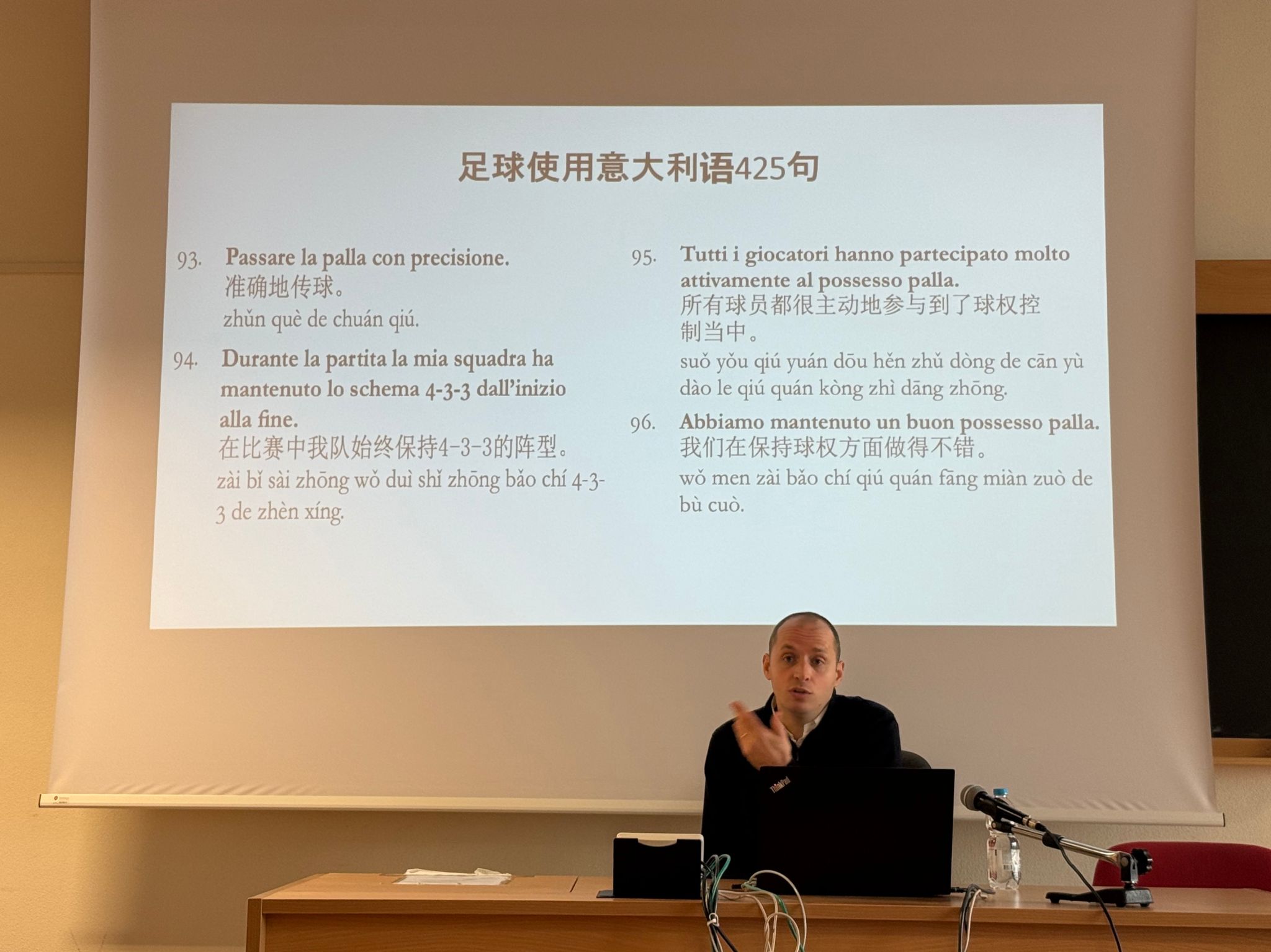 在术语讲解环节,雅各布结合其著作《意汉足球术语手册》,系统介绍了足球位置名称、常见阵型及相关战术术语的中文表达,如“精准传球”、“保持控球”、“边路进攻”等。通过意汉对照示例,他进一步阐释了术语在实际比赛场景中的使用逻辑,帮助听众理解语言与战术之间的内在联系。