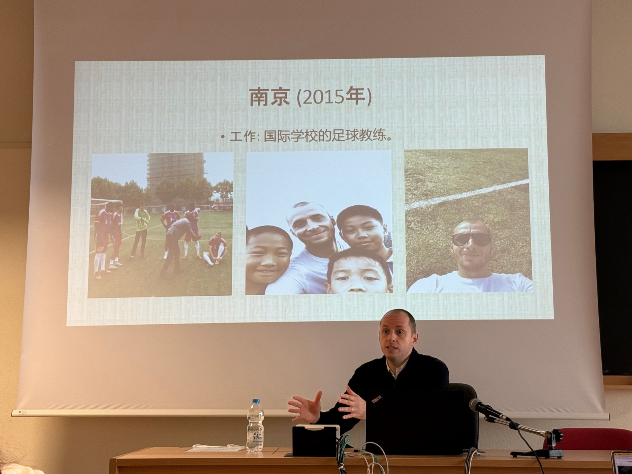作为一名曾在中国执教的足球教练,雅各布以“我为什么决定去中国”开场,按时间线回顾了自己在南京、厦门、上海、成都等七座城市的教学与生活经历。他展示了大量在中国工作与旅行的照片,勾起了在场学生对赴华学习和就业的兴趣。