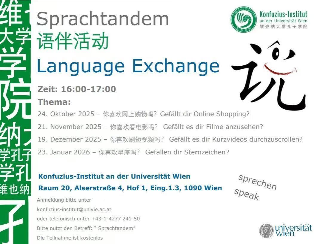 维也纳大学孔子学院本学期将陆续举办多场语伴活动,为中文和德语学习者以及中国文化爱好者搭建交流平台,使活动参与者在提高语言水平的同时结交新朋友。