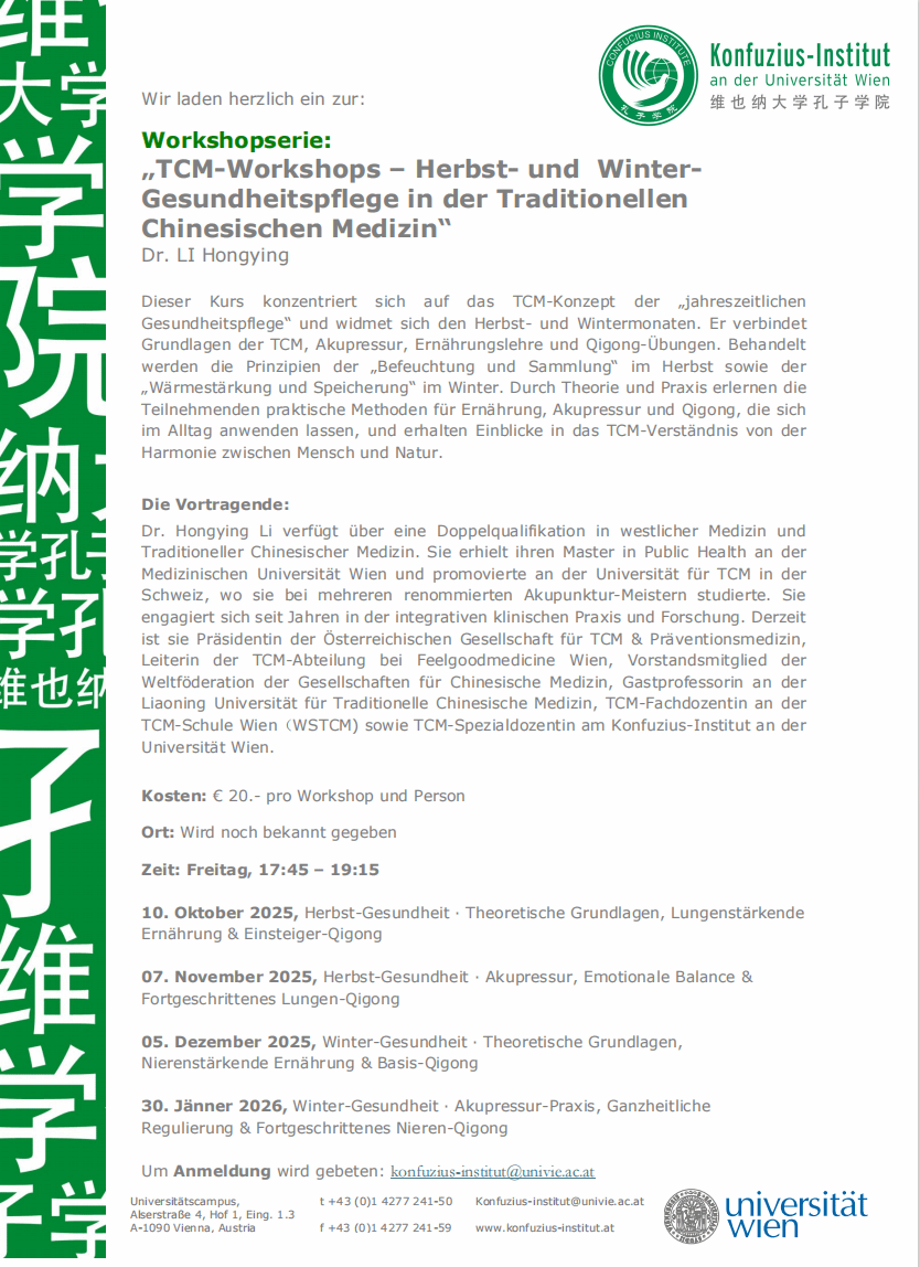 当地时间12月5日,维也纳大学孔子学院成功举办了本年度第三期秋冬中医养生工作坊,吸引了10位当地中医爱好者参与。本次工作坊历时1.5小时,采用“理论讲解+实践体验”的模式,旨在将中医“顺时养生”的智慧融入现代生活。