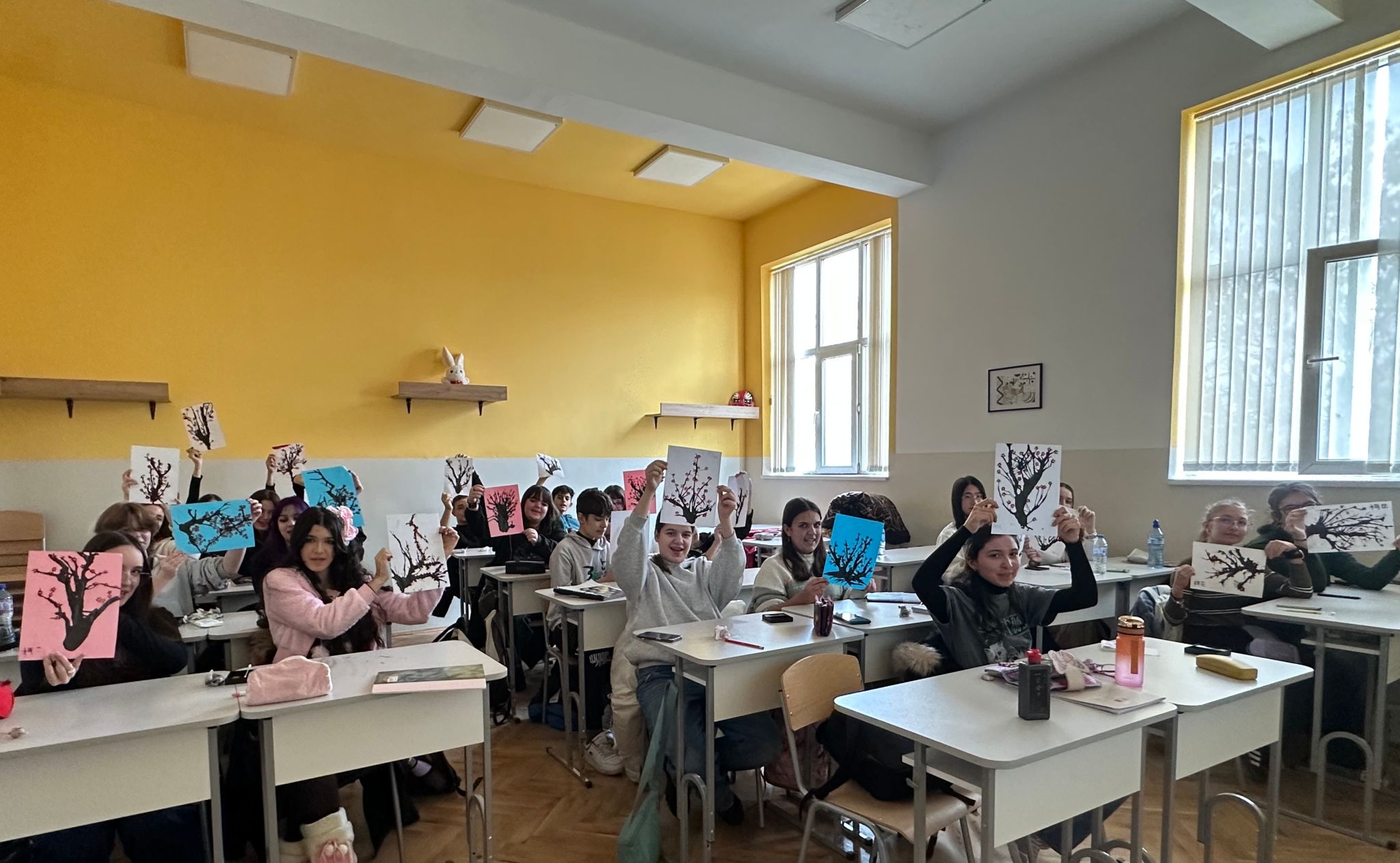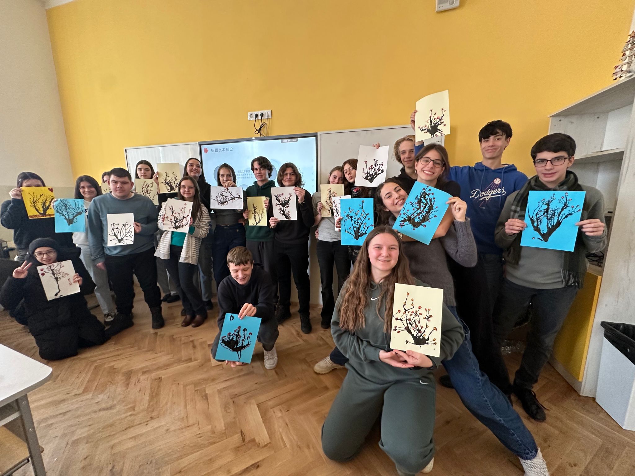当地时间1月13日,索非亚孔子学院下设第18中学孔子课堂举办“吹墨画梅”中国画体验活动。孔子课堂中文教师与该校近60名学生参加。