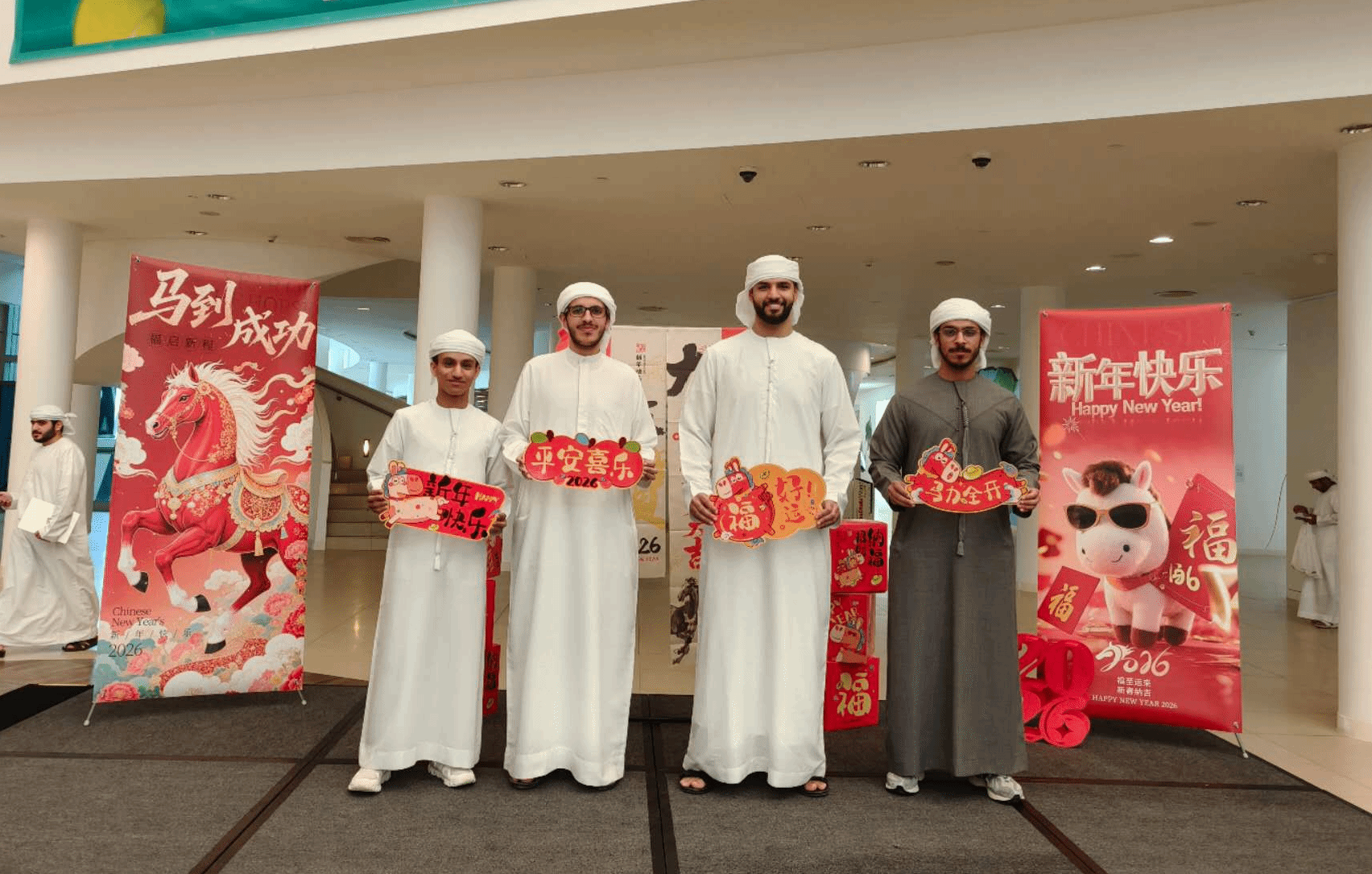 当地时间1月19日,扎耶德大学孔子学院在扎耶德大学阿布扎比校区举办了以“欢度春节,中文启航”为主题的春节庆祝活动。本次活动以丰富多元的沉浸式体验,吸引了校内师生300余人参与,让浓郁的中国年味在扎耶德大学校园里绽放光彩。