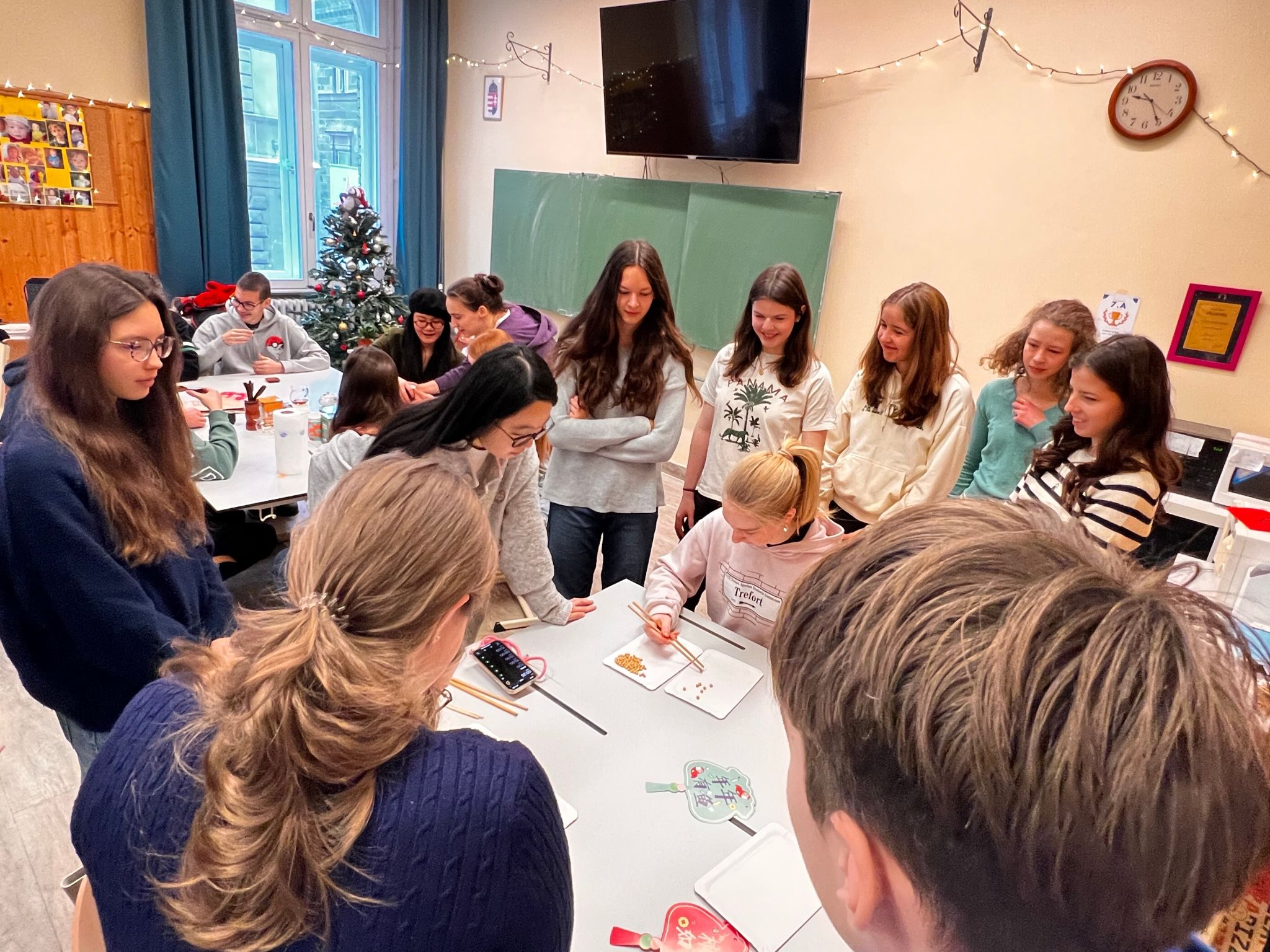 活动正值春节前夕与特莱福中学活动日,孔子学院教师设计了书法、茶艺、夹豆子和踢毽子等文化体验项目,让学生直观感受汉语和文化的魅力。在书法体验区,教师讲解“福”字的寓意,示范书写技巧,学生们专注临摹。茶艺展示环节,教师演示温杯、投茶、注水等传统茶艺流程,并介绍不同茶类的特点,学生们驻足品鉴。趣味活动中,学生们通过夹豆子比赛熟悉筷子用法,通过踢毽子感受中国传统运动的乐趣。