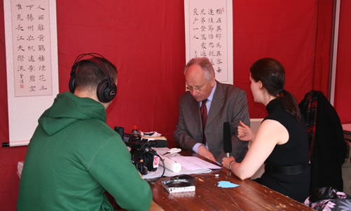 汉办的高级顾问、杜塞尔多夫孔子学院的理事会主席拉碧士教授在孔子学院的展棚里接受了“德中传媒”的现场采访,他在采访中谈到:德、中两国之间的经济和文化联系日益密切,中文学习在德国人当中也越来越普遍。杜塞尔多夫孔院今后将会举办和参与更多类似的文化推广活动,他也欢迎更多的朋友能够来孔子学院学习中文并了解中国的文化