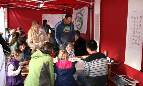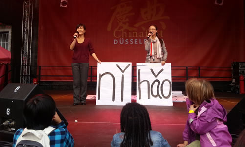 2013年9月21日,第三届“龙腾杜塞尔多夫”中国节在杜塞尔多夫市集市广场如期举行。今年,杜塞尔夫妇孔子学院不仅在自己的展位里为观众准备了体现中国语言和文化的精彩活动如汉语体验课、书法速成课,来自孔子学院的于淼和李娟老师还在集市广场的中心大舞台上为前来参观的德国游客带来了两堂生动有趣的汉语体验课,成为本次“中国节”的一大亮点。