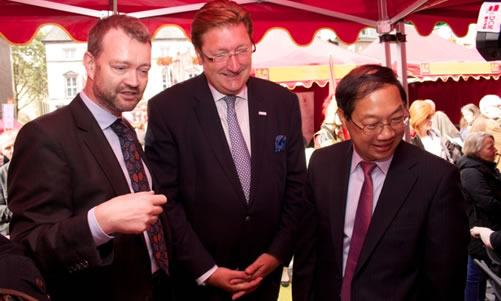 杜塞尔多夫市长迪克·艾博思、中国驻德国大使史明德在孔子学院中、外方院长的陪同下来到孔子学院的展台进行参观。此时,展台围满了前来参加中文体验课和书法速成课的人群,杜塞尔多夫市市长艾博思兴致勃勃的跟着中文老师一起学习了中文的“你好”和“谢谢”。