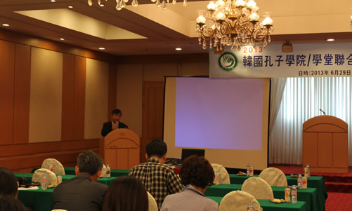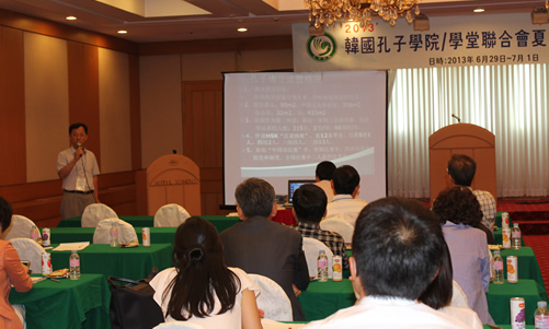 2013年6月29日-7月1日,韩国孔子学院联合会夏季会议在济州岛召开。本次会议由韩国孔子学院联合会主办,韩国外国语大学孔子学院承办。共有来自韩国江源大学孔子学院、庆熙大学孔子学院、启明大学孔子学院、大真大学孔子学院、东西大学孔子学院、东亚大学孔子学院、首尔孔子学院、世翰大学孔子学院、顺天乡大学孔子学院、安东大学孔子学院、又石大学孔子学院、仁川大学孔子学院、忠南大学孔子学院、韩国外国语大学孔子学院、湖南大学孔子学院等15家孔子学院的中韩方院长和来自自律华山中学孔子课堂的中韩方负责人参加了本次会议。