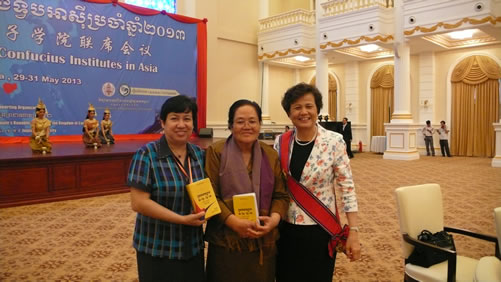 5月29日-6月1日,代表团一行参加孔子学院总部/国家汉办在柬埔寨首都金边举行的“2013年亚洲孔子学院联席会议”。5月29日下午,金莉副校长陪同国务院参事、国家汉办主任、孔子学院总部总干事许琳受到柬埔寨首相洪森的亲切接见,赠送了我校汉语推广多语种基地和外研社联合出版的《汉语小词典》(柬埔寨语版)。洪森首相非常高兴能够收到这份礼物,表示可以带回家帮助家人学习汉语。随后,应我国驻见柬埔寨大使潘广学要求,金莉副校长将该词典赠送给我国驻柬埔寨大使馆、柬埔寨王家学院校长、柬埔寨王家学院孔子学院各5本。