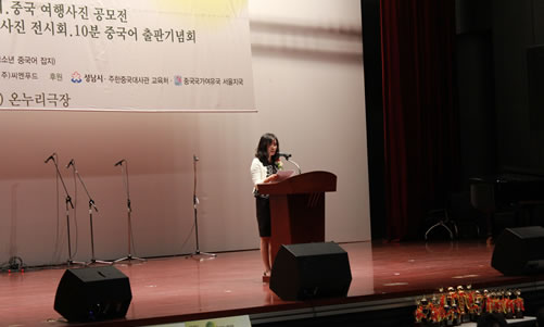 4月28日,由韩国外国大学孔子学院和人民网韩国新闻分社共同举办的首届“韩国人唱中国歌大奖赛”决赛在韩国城南市政府世界剧场成功落下了序幕,本次活动是人民日报·人民网韩国新闻社主办的“中韩通青年文化庆典(以下简称‘庆典’)”的一个重要组成部分。出席此次活动的嘉宾有城南市市长李在明,中国驻韩国大使馆教育处一等秘书王克媛,韩国外国语大学孔子学院院长孟柱亿、万玉波,新华社首尔分社社长冮冶以及人民网韩国新闻分社代表周玉波。此外,还有600余名观众到场观看了比赛,为选手们加油助威。