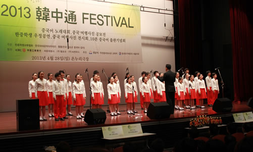 “韩国人唱中国歌大奖赛”通过4月13日的预选赛,在98组选手中选拔了32组选手参加最终的决赛,这些参赛选手全部为“非中国籍”。在城南市少男少女合唱团悠扬的歌声中,大赛拉开了帷幕。选手们个个情绪饱满,粉墨登场。有的选手演绎了时下人气最高的流行歌曲《我的歌声里》,有的选手则深情演唱了经典老歌《祝福》,还有的选手演唱了中文版的《我的太阳》,其中《我爱你中国》、《爱我中华》等中国人耳熟能详的经典歌曲在众多的流行歌曲中更是独树一帜。选手们准确的汉语发音,高超的演唱技巧让台下的观众不禁为他们欢呼鼓掌。经过4个小时的激烈角逐,李丹英选手荣登冠军宝座,并同时获得获得100万韩元(约合人民币5600元)的奖金;获得亚军的是李哲重、李慈英兄妹组合,他们同时获得了免费游中国的“旅游商品券”。在此次庆典中,韩国嘉泉大学中国留学生为观众们带来了精彩的二胡表演;全韩中国留学生艺术团团长邹泺铱表演了中国传统舞蹈;韩国外国语大学孔子学院的学生们为大家表演了中文话剧《春香新传》的片段,让观众们笑声不断。