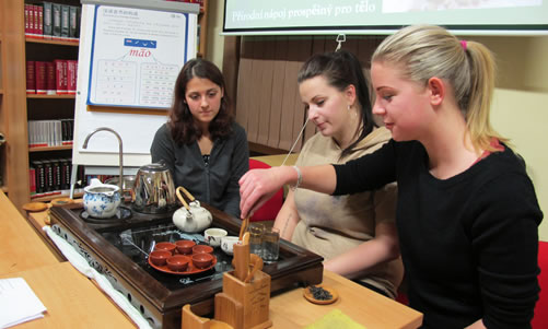 茶艺课由志愿者教师杨芷一授课。课程分茶的基本知识介绍(茶的历史、种类及地域、制作工艺以及禁忌和功效)、茶艺介绍(茶艺精神、礼仪)、茶艺表演以及学习(茶具介绍、教师示范以及学生个人实践)三部分。该课程结合捷克语PPT文字材料和英语授课,让学生在学习茶艺理论的同时,更有机会亲自动手实践操作。