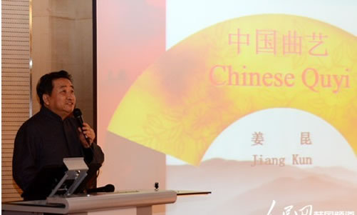 中国著名相声表演艺术家、中国曲协主席姜昆在“中国传统曲艺艺术”专题讲座中详细介绍了中国曲艺艺术发展的历史、地方曲艺特点及对外交流情况等。姜昆老师的演讲生动风趣,不时激起现场观众的阵阵掌声。同时,杨菲、王占新、戴志诚、袁小良、闫淑平、戴志诚等艺术家用穿插表演的方式为在座的150余名中韩两国观众奉上了梅花大鼓《霓裳羽衣舞》、二人台说唱《王婆观灯》、苏州弹词《人面桃花》、二人转《猪八戒背媳妇》、相声《乐在其外》等视听盛宴。