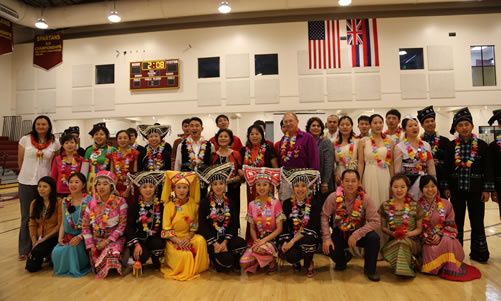 云南少数民族艺术团首先来到夏威夷Niu Valley 中学进行了两场演出交流,共300多名学习中文和音乐的学生参加。Niu Valley中学校长Justin Mew先生在演出前致词,对来自中国云南的少数民族艺术家表示热烈欢迎,并高度评价孔子学院对于这次文化交流的贡献。他表示,这样的活动对于该校学生了解中国、拓展国际视野具有重要意义。