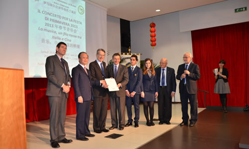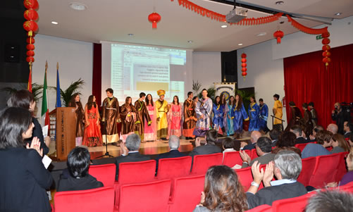 该校校长法多维科和汉语教学项目负责人阿拉利奥在晚会开始之前发表了热情的讲话,表示愿意以汉语为载体,以艺术为桥梁,沟通中意两国青少年的心灵,促进该校的汉语教学,为中意两国人民的友谊做出贡献。意大利教育部长普罗弗莫很关注该校的汉语教育,这已经是他十天之内第三次莅临该校,为学习汉语的学生来华留学和顺利参加中国大学入学考试而奔走,他相信在不久的将来,会有百倍于现在的意大利高中毕业生选择去中国读大学。演出结束后,外交部长特尔奇、教育部长普罗弗莫以及中国大使丁伟先生和罗马大学副校长马西尼教授共同登台,为该校通过HSK汉语水平考试的学生颁发了证书。