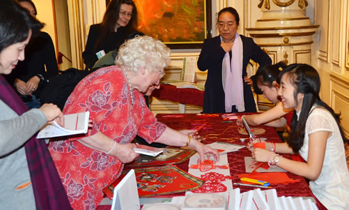 维也纳大学孔子学院也为到场的每位嘉宾准备了新春礼物,各位老师们亲手为大家制作了新年的幸运手链、精致的玫瑰花、以及剪纸娃娃,并且现场为大家展示中国结和剪纸艺术表演,到场的嘉宾被这些中国元素深深吸引,纷纷戴上幸运手链。