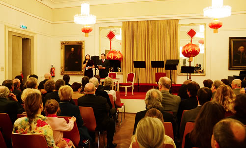 在莫扎特的《D大调小步舞曲》中,迎新春庆典拉开帷幕,维也纳大学孔子学院奥方院长李夏德教授和中方院长王静女士共同主持了欢迎仪式,演出重点表现“欢乐、丰收、和睦、共享”的春节文化内涵,内容包括诗歌朗诵、马头琴表演、大提琴钢琴合奏等。悠扬的马头琴带来的表扬就像成千上万匹骏马奔驰在广阔的草原上,这种具有中国民族特色的马头琴表演让在场的嘉宾纷纷称赞,演出过程中不时爆发出阵阵热烈的掌声。Jing Gatke的大提琴和隋博睿的钢琴结合在一起,美妙的乐曲让大家沉浸在这场新春晚会中。维也纳大学孔子学院中方院长王静和Doris Buchner女士的中德双语朗诵也是本次晚会的重头戏。享誉世界的《红楼梦》节选以及中国古代著名诗人孟浩然、李白的诗句给这场晚会增添了无限的韵味。观众纷纷表示在欣赏中国民族音乐的同时,感悟到了中国古典诗词文学的艺术魅力,获得情感的体验、精神的陶冶,激起了不少人对中国古典文学的兴趣。