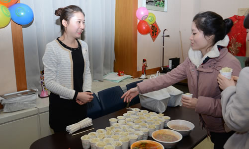 “中国知识竞赛”之后,是大家期待已久的“吃水饺”活动。当热气腾腾的中国水饺被端上来时,香味儿扑面而来,学员们争先恐后地开始品尝。中级班学员郑希恩一边吃一边伸大拇指,感叹到:“中国的水饺和韩国的不一样,中国的水饺更香,更好吃!”