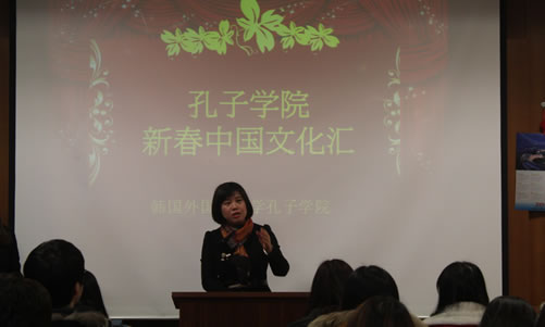 2013年2月1日下午,韩国外国语大学孔子学院举办“2013年新春中华文化汇”活动,近70名孔子学院学员和中韩方教师齐聚在孔子学院的文化体验室,提前庆祝2013年农历新年的到来。本次活动由中国知识竞赛、猜灯谜、吃水饺、品茗茶、练书法、玩皮影六大“中国元素”板块构成,每部分的设计都别出心裁,中国味儿浓厚。孔子学院中方院长万玉波老师这样介绍到:“我们的‘新春中华文化汇’是中华传统文化元素和春节年味儿的结合,一切都是‘中国味儿’,我们要让学员们身临其境地感受中华文化的魅力,在我们孔子学院过一个难忘的中国年。”