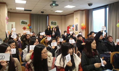 下午一点三十分,“2012年新春中华文化汇”在热烈的掌声中拉开帷幕,第一项是有奖中国知识竞赛环节,题目是一些中国文化的小常识,每个学员手中都有标有序号的四张答案牌,选择答案时只需举起相应的号码牌即可。选择错误的错误的学员,答案牌将被收回,被大赛淘汰;选择正确的学员将继续比赛。经过几个回合的激烈角逐和复活赛,大奖终于被中级班学元黄志秀获得。