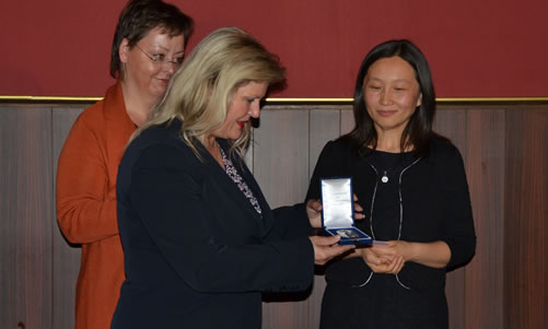 维也纳大学孔子学院的院长王静女士首先致辞,欢迎五位远道而来的格特鲁德·瓦格纳的子女、莅临现场的各位中奥使节和热情的观众,并向大家简单介绍了影片的故事情节和历史背景。接下来维也纳市议会议员代表维也纳致辞,并代表维也纳市长将五枚特色纪念勋章赠送给格特鲁德·瓦格纳的五位子女,祝他们在维也纳过得舒心愉快。五位兄弟姐妹也向维也纳市政府和维也纳大学孔子学院赠送礼品,并表达他们深深的谢意。