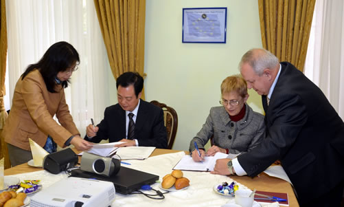 本次谈判在轻松愉快的气氛中进行。经过磋商两校就互换师生、共同进行理论研究、共同举办学术研讨会等多方面达成共识并签署了协议。莫斯科国立语言大学孔子学院中俄两院长应邀参加了会谈并为会谈提供了语言支持。