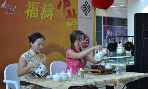 中秋佳节,有好故事、好歌曲,怎么能没有月饼和好茶?瓦尔纳的汉语志愿者周姣老师和爱好中国文化的李美阳女士,为现场观众表演了赏心悦目的双人茶艺,大家一边品尝着中国的月饼,一边享受着袅袅香茗,没有美酒,却不知不觉已如痴如醉。
