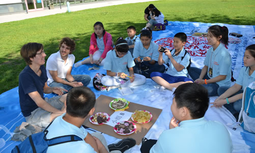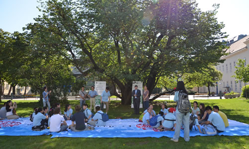 维也纳大学孔子学院院长李夏德教授和王静女士致词热烈欢迎小记者和家长们的到来,招待会正式开始。小记者们分为两组与前来的奥地利学生们互相认识交流。小记者们虽然年龄小但个个说一口流利的英语。他们对对面的奥地利学生们充满了好奇,问题涉及到他们的学习,业余爱好,喜欢的食物等等并且学习了几句简单的德文,如你好,再见。大家一边讨论一边品尝孔子学院为他们精心准备的具有奥地利特色的食物和饮料,如莫扎特球。这些身怀绝技的小记者们,还为大家表演了精彩的节目,如双簧管、武术和小合唱,赢得了阵阵掌声和赞誉。这片绿茵茵的草坪上充满了欢声和笑语。
