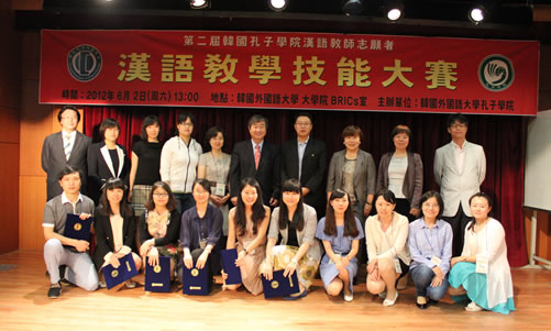 2012年6月2日,韩国外国语大学孔子学院成功举办“第二届韩国孔子学院教师志愿者教学技能大赛”。比赛形式沿用了第一届的模式,分为论文、课件和现场教学演示三个板块。和第一届大赛相比,无论参赛稿件的数量和质量,还是参赛作品的策划角度,都有了很大的进步。作为大赛评委之一的王霞教授在总评时详细阐述了她对参赛作品的分析认知,最后还非常谦虚地开玩笑说“长江后浪推前浪,前浪死在沙滩上”,让所有的教师志愿者感到了自己肩上的责任,并树立了做好汉语推广工作的自信心。