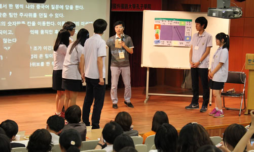 作为整场大赛最精彩的环节,现场教学演示无疑是最吸引人眼球的部分,经过初选,分别来自八个孔子学院的汉语教师志愿者根据抽签顺序依次上台进行了教学演示。在20分钟模拟课堂上,教师志愿者们根据自己教学对象的特点使用了各种教学用具,图片影像资料生动丰富的PPT,设计简单有趣的游戏图版,日常生活中的实物展示,甚至还有给参与游戏优胜者准备的糖果,所有的这些让来自安养外国语高中的学生们(大赛主办方特别邀请的模拟课堂的高中学生)高兴地,一步步跟着参赛者的讲课节奏顺利的完成了教学任务。而坐在台下的与会者们也全神贯注地关注着参赛者和模拟课堂学生们的每一个反应。从课堂导入,开始词汇讲解,语法讲解,到机械操练,最后到布置作业,要在短短20分钟完成确实不是一件容易的事,但是每位参赛选手把握住了节奏,在计时员的提示下,顺利完成了自己的教学演示。
