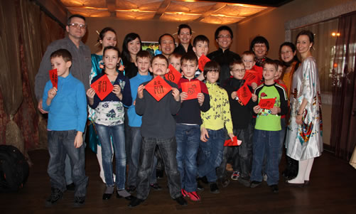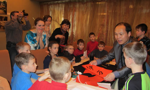 莫斯科国立语言大学孔子学院的张金兰老师为孩子们分发了不同字体所写的“福”字,由兴波老师现场展示了中国书法,并用汉字为每个孩子写了他们各自的名字,让孩子们大开眼界,叹为观止。当由兴波老师在纸上写下了汉字的“中国”、“俄罗斯”时,一个小男孩用俄语说:“我知道,中国和俄罗斯是朋友。”张金兰老师补充道:“中国和俄罗斯世代是好朋友。”孩子们对毛笔和汉字产生了浓厚的兴趣,纷纷上前拿起毛笔摹画起来。由兴波老师还为孩子们演示了太极拳,使孩子们对中国文化有了直观的认识,通过亲身实践,增长了见识,增加了阅历。