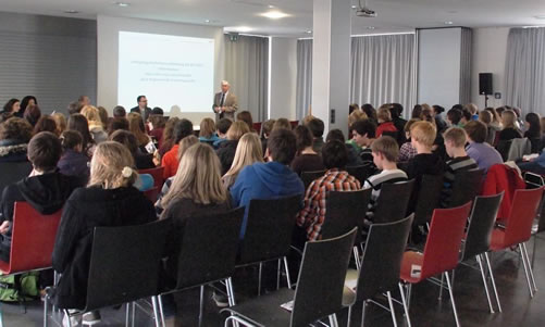 宣讲会由Paul Fleischer校长主持,校长先生首先向全体人员致辞。随后,学校督导Stefan Weiß先生,深圳市驻欧洲经贸代表处章毅平主任,纽伦堡-埃尔兰根孔子学院的Iris Lutz女士,以及教师兼企业咨询师Mingxia Thiel女士也做了精彩的报告。Weiß督导先生指出汉语发挥着越来越重要的作用,愈加受到人们的重视。章毅平主任用生动精彩的纪录短片向同学们介绍了纽伦堡的姐妹城市——深圳。Iris Lutz女士向大家介绍了孔子学院的课程和活动项目,使大家了解到,学习汉语可以有多种轻松愉快的方式。Iris Lutz女士还介绍了她在中国学习的经历,让大家感到非常亲切。而当她用流利的汉语脱口而出说出“我骑自行车去长城”时,全场震撼。Mingxia Thiel女士向同学们系统地介绍了汉语的学习内容、方法和策略,引得在场嘉宾和同学们的阵阵喝彩。