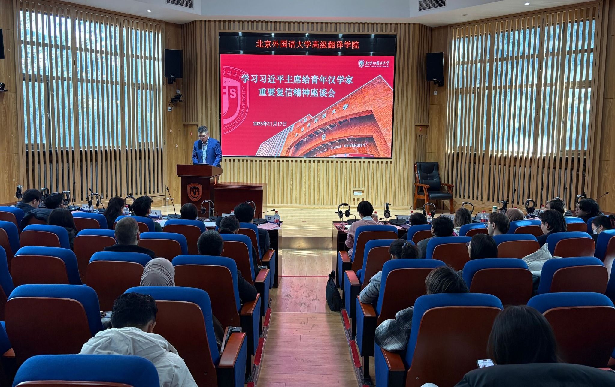 11月17日,北京外国语大学举行学习习近平主席给青年汉学家重要复信精神座谈会。党委常委、副校长赵刚出席会议。孔子学院工作处、中国语言文学学院、国际中国文化研究院负责同志,教师代表,留学生代表等60余人参会。会议由孔子学院工作处副处长刘晓辰主持。
