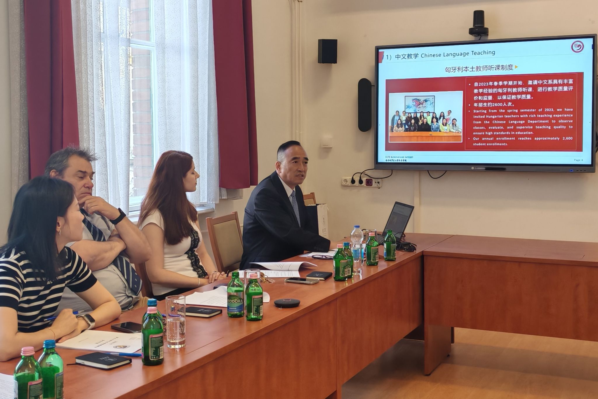 当地时间6月6日,罗兰大学孔子学院召开2025年理事会议。罗兰大学副校长、孔子学院匈方院长郝清新(Dr. Hamar Imre),北京外国语大学党委副书记胡志钢、匈牙利研究中心主任郭晓晶、孔子学院工作处副处长刘晓辰,罗兰大学孔子学院中方院长李登贵等出席会议。